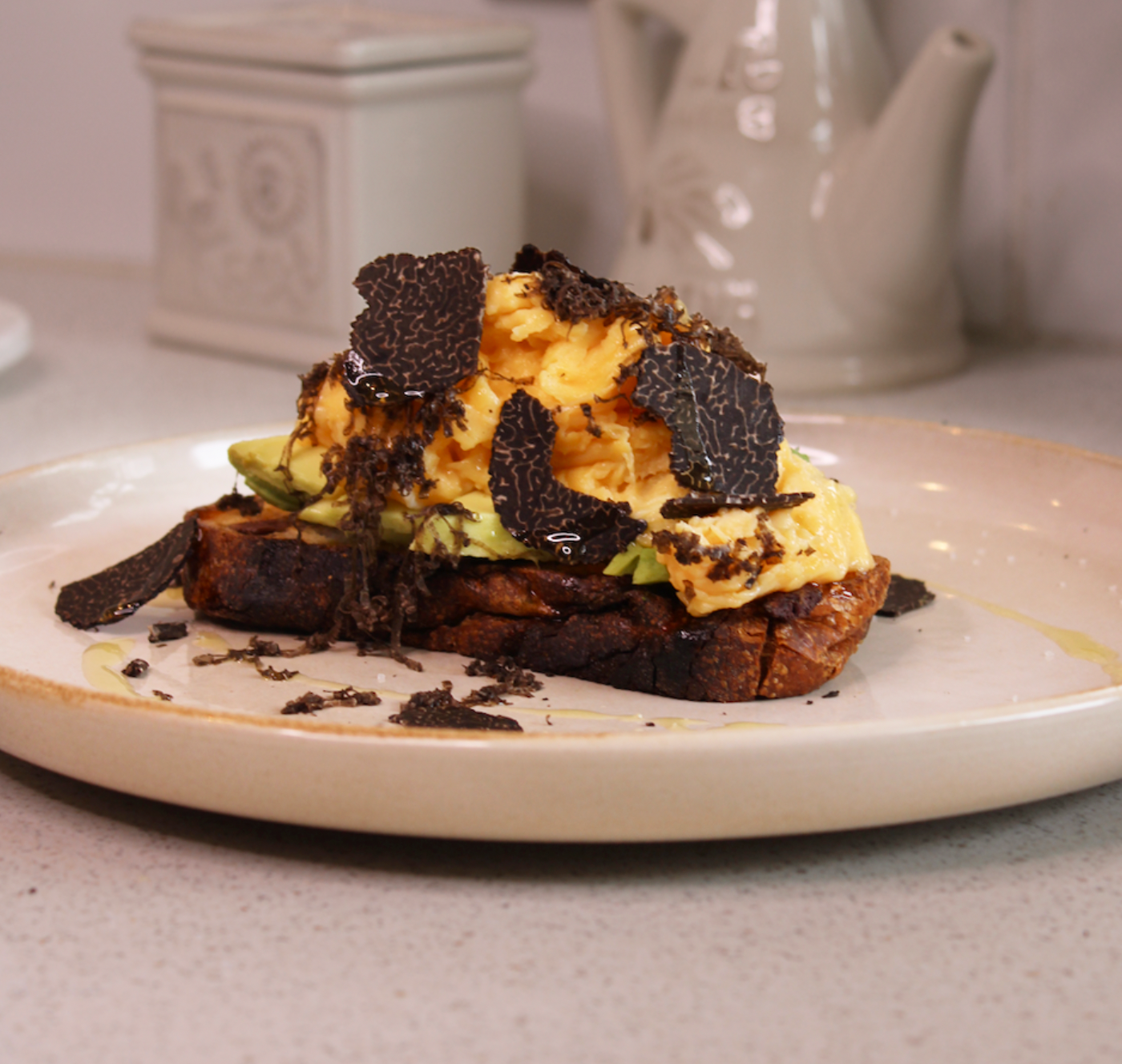 This breakfast recipe featuring toast topped with creamy avocado, perfectly scrambled eggs, and truffle. This delightful combination of flavors and textures will elevate your morning routine and provide a delicious start to your day.